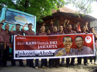 Rombongan tim pemenangan Jokowi-Ahok dari Sragen dipimpin langsung Ketua DPC PDIP Sragen, Bambang Samekto, yang juga menjabat sebagai Ketua FPDIP DPRD Sragen. Mereka mengenakan baju kotak-kotak warna merah lengan panjang yang biasa digunakan Jokowi-Ahok dalam sosialisasi pencitraan menjelang Pilgub DKI Jakarta.